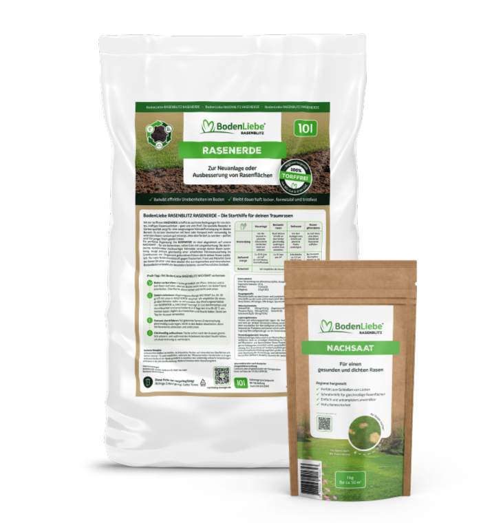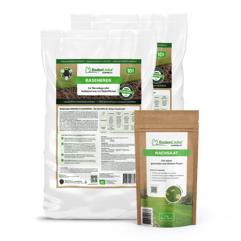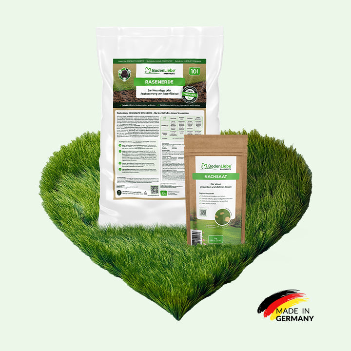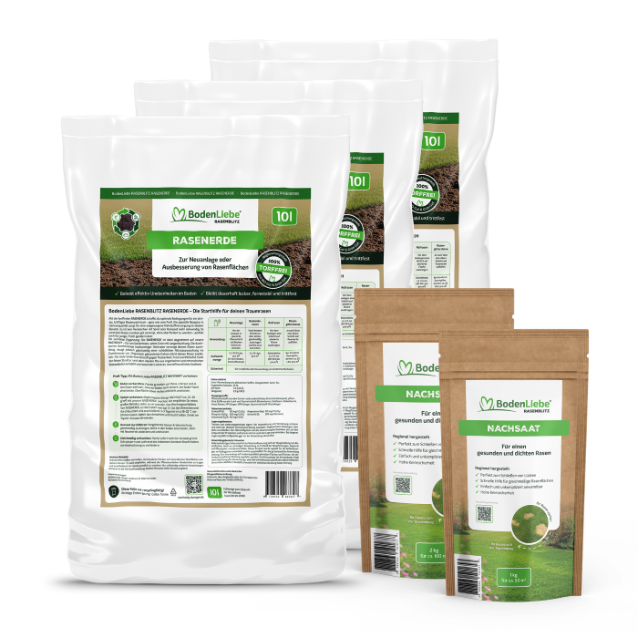 Das NOTFALLSET überzeugt durch seine hochwertige RASENERDE, welche aus pflanzlichen Stoffen mit hochwertigen Nährsalzen hergestellt ist und der Premium NACHSAAT, welche eine hochwertige RSM-Mischung ist und sich für nahezu alle Rasenarten eignet.