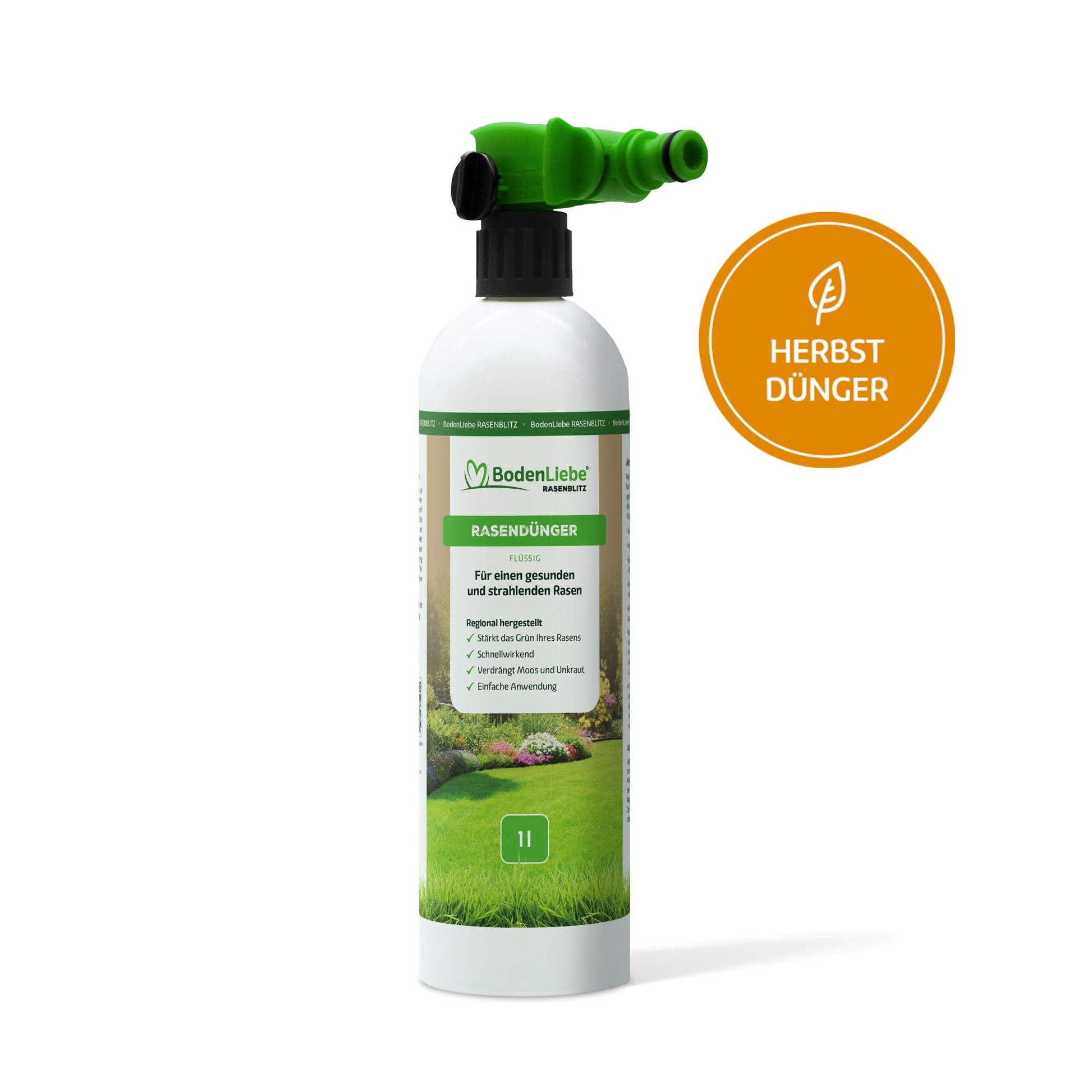 Unser flüssiger Rasendünger mit praktischem Sprühkopf lässt sich direkt an den Gartenschlauch anschließen und sorgt für eine gleichmäßige und präzise Nährstoffverteilung auf der gesamten Rasenfläche: